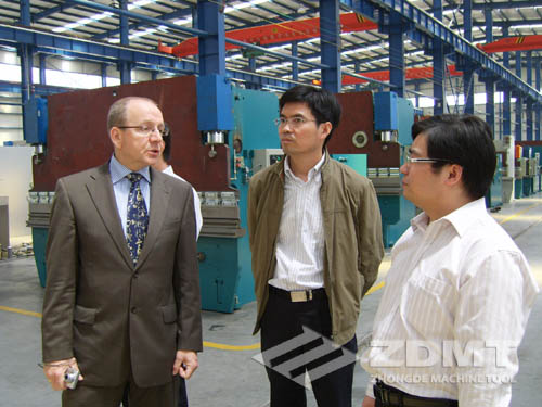 在整個(gè)的參觀過(guò)程里, EDWIN先生了解了我們先進(jìn)的工廠(chǎng)全程監(jiān)控系統(tǒng),寬敞明亮的工作車(chē)間以及外形簡(jiǎn)潔優(yōu)雅的產(chǎn)品。相信在韓總流暢的英文翻譯下,EDWIN先生一行對(duì)本地區(qū)剪折行業(yè)的發(fā)展?jié)摿σ欢ㄓ辛诵碌恼J(rèn)識(shí)。同時(shí),我們很感謝韓總和EDWIN先生,他們站在一個(gè)全新的角度,對(duì)中德機(jī)床提出了建設(shè)性的建議。我們也希望中德機(jī)床精益求精,同ESTUN公司和DELEM產(chǎn)品建立更緊密的關(guān)系,將中德機(jī)床推向更廣闊的市場(chǎng)。