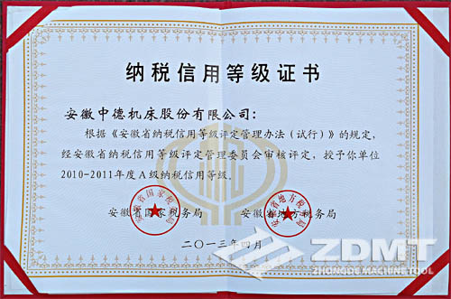 中德機(jī)床喜獲安徽省“A級納稅信用等級單位”稱號